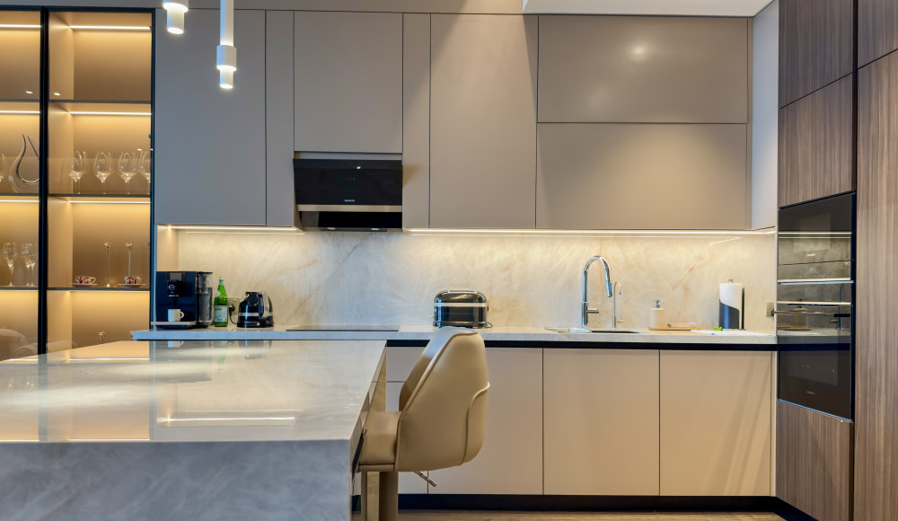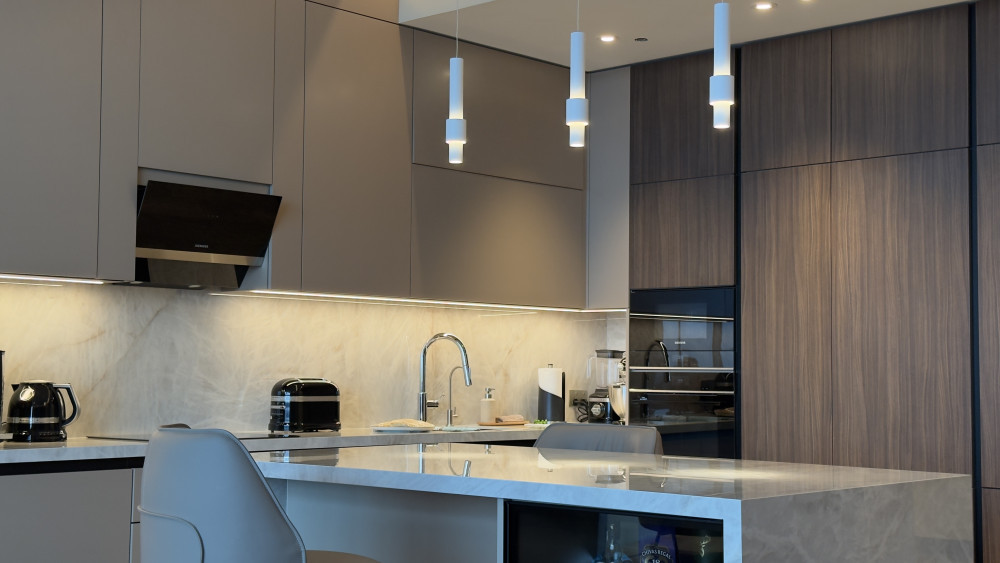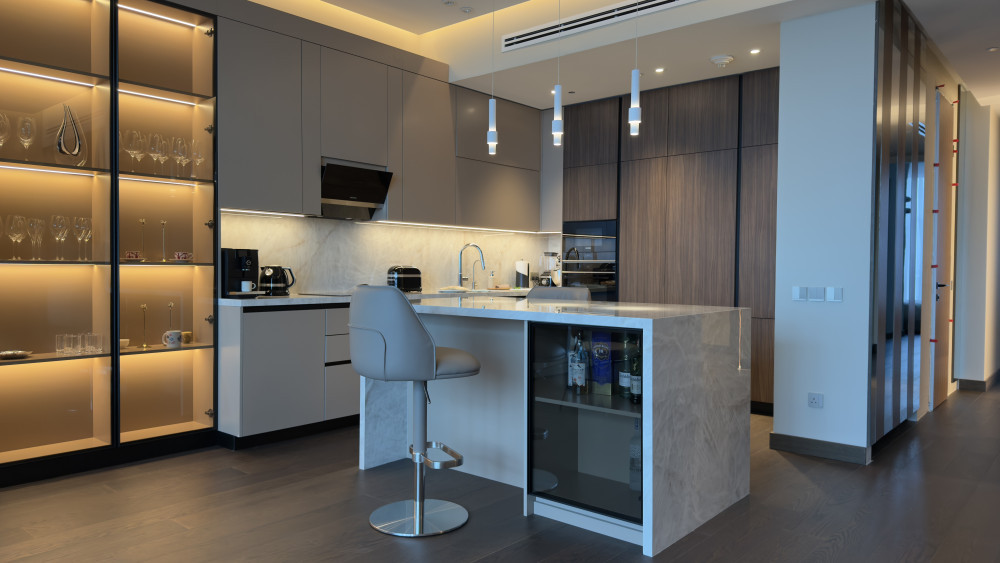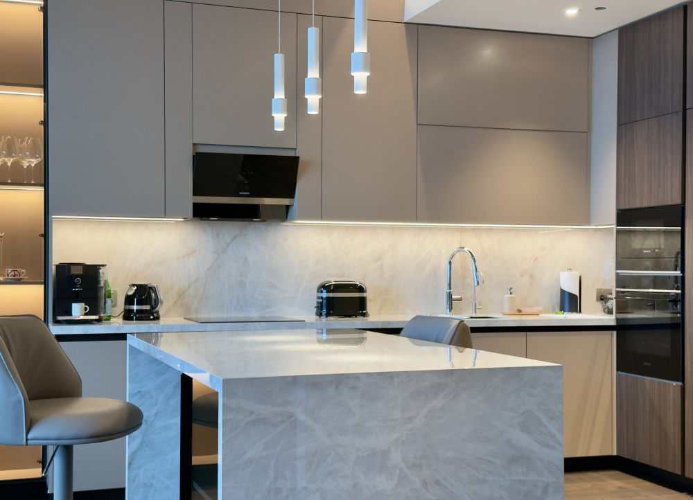At Palm Jumeirah, Adriatic Building A, we delivered a kitchen concept defined by refined simplicity and expert fabrication. Using large-format slabs of the Atlas Plan Crystal White marble-effect porcelain, our craftsmen executed precision-cut panels for the wall cladding, island top and countertop. The result: a seamless, minimalist aesthetic that showcases the material’s elegance while reinforcing our commitment to fine craftsmanship.