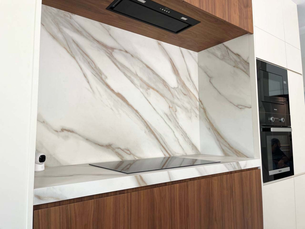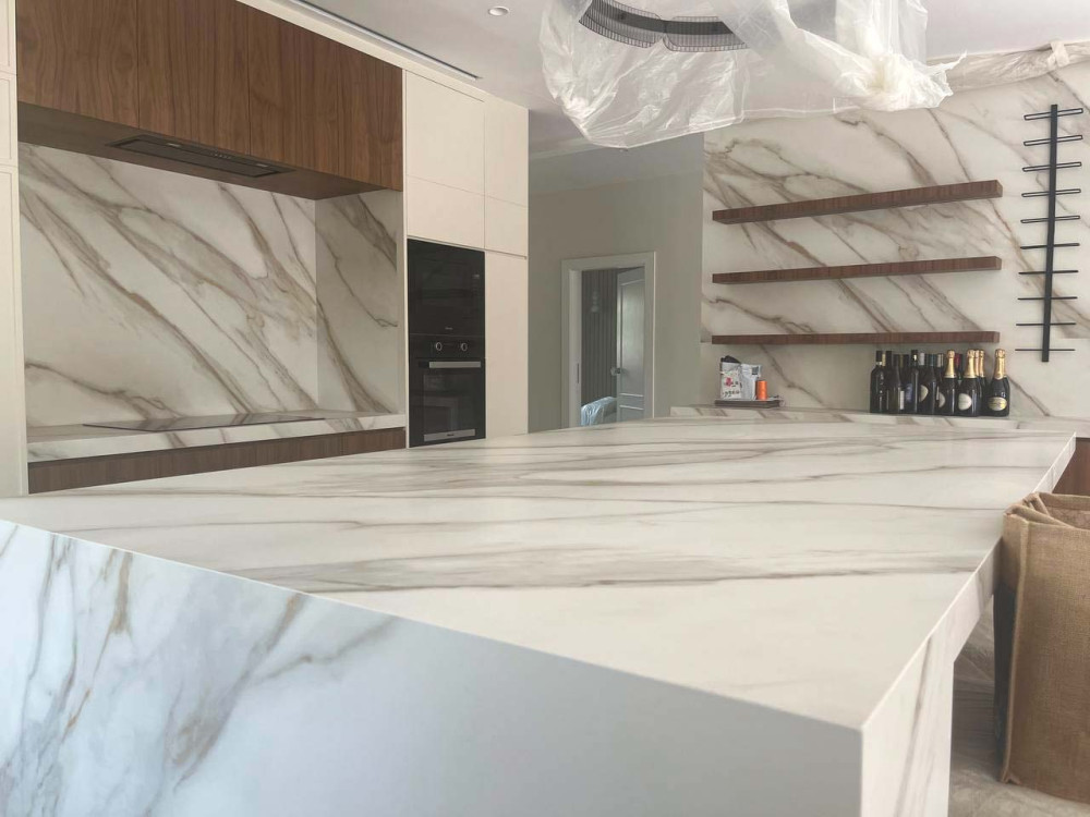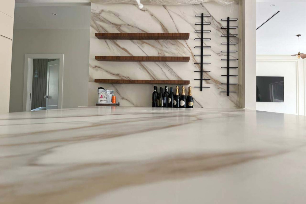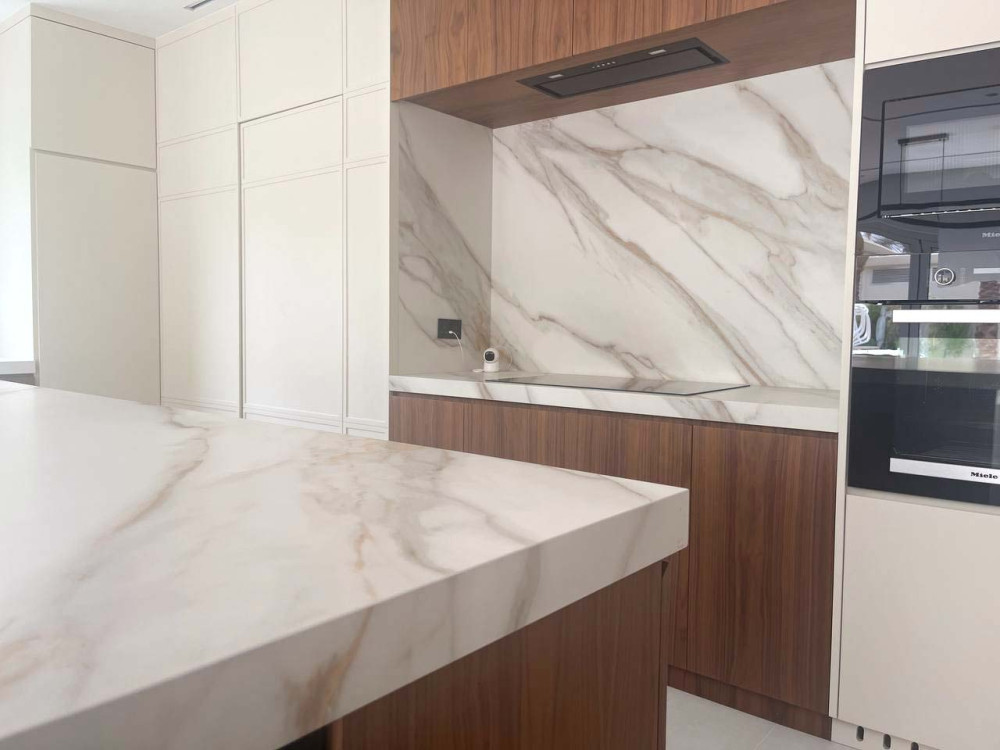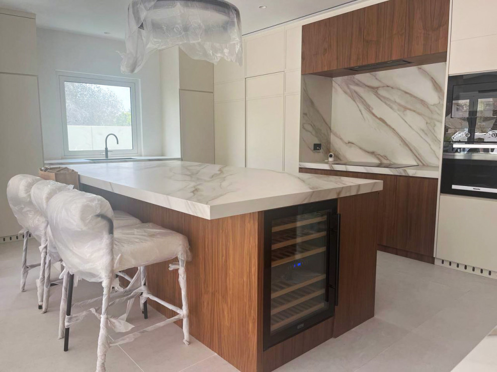 At a villa in Meadows 1, Dubai, we brought to life a vision of timeless opulence through the fabrication of Royal Gold — an expansive 160 × 320 cm slab by Castle Stone, featuring rose-gold tonality and gentle grey veining. Our expert fabrication team handled the precision cutting, finishing and installation to achieve a flawless, seam-minimal surface that flows across countertops, wall surfaces and feature elements. This project demonstrates our mastery in large-format stone fabrication and our ability to transform luxury materials into remarkable spatial narratives.